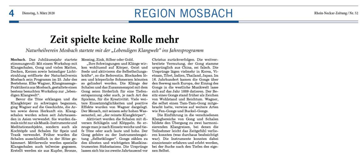 Im März 2020 berichtete die Rhein-Neckar-Zeitung über meinen Workshop “Lebendige Klangwelt”, den der Naturheilverein Mosbach veranstaltete. Hier findest Du den Bericht