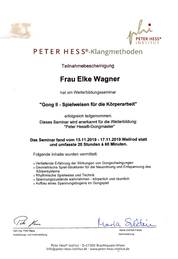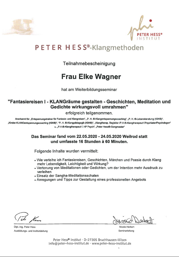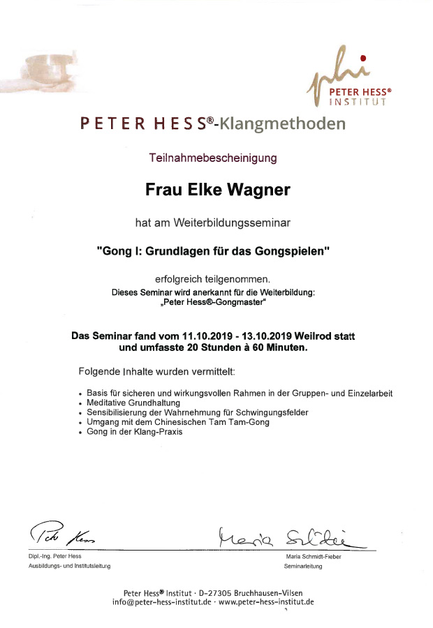Bestimmung war es, bei diesen Entspannungsmaßnahmen meine spätere Ausbilderin, Isabelle Breitenbach, kennenzulernen. Sie selbst genoss bei Peter Hess ihre Ausbildung zur Klangschalen- Therapeutin und vermittelte als Ausbilderin mit feinstem Spürsinn ihr Wissen von Peter Hess.